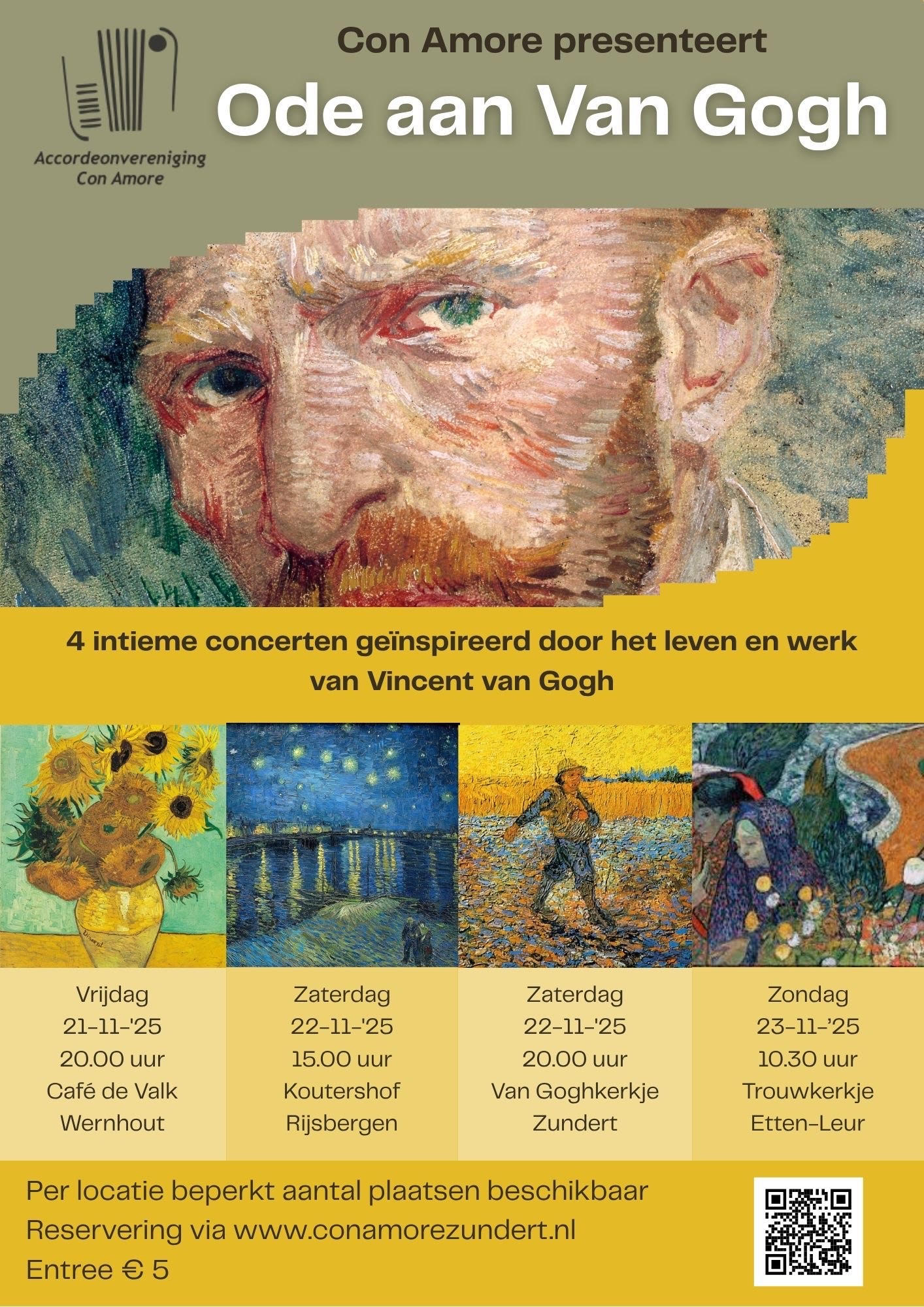 Con Amore kiest elke twee jaar een nieuw thema als inspiratie voor hun ‘Music Night’. Het orkest brengt dit jaar muziek, die een belangrijke rol gespeeld heeft in Van Goghs leven, muziek die veel voor hem betekende of hem inspireerde. En vervolgens horen we ook muziek, waarbij de componist op zijn beurt geïnspireerd werd door de kunst van Van Gogh.